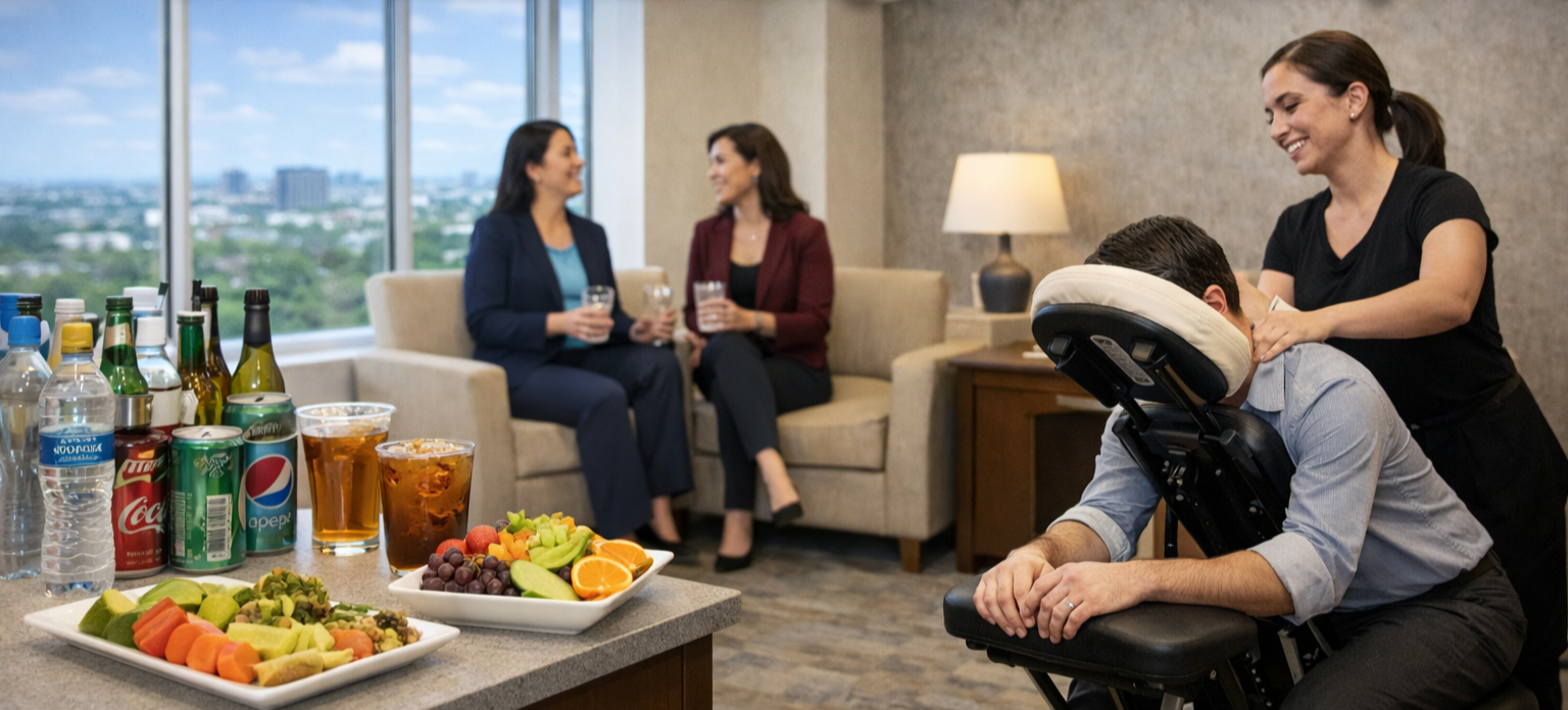 Guests are welcome to stop by at their convenience to enjoy light refreshments, a beverage, or simply take a break. We will also have a professional chair massage available during select times. (Reserve your complementary chair massage here.)